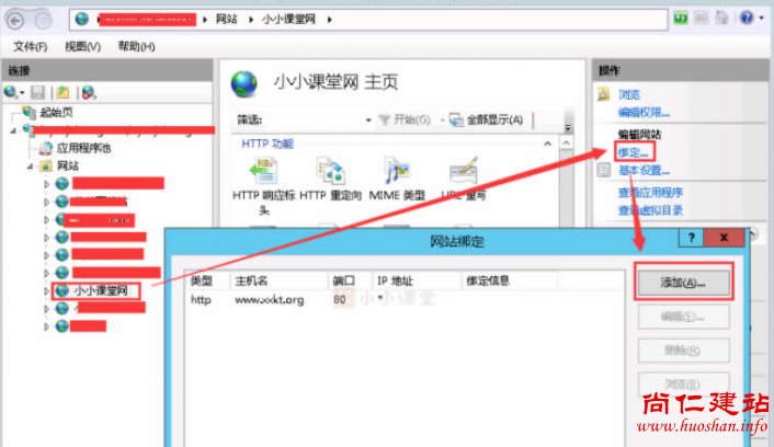 在IIS8中找到需要绑定的域名,点击后,找到右上角的“绑定”,最后点击“添加”。