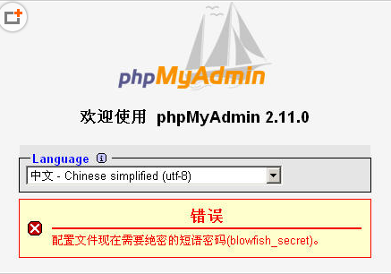 11、查找$cfg['blowfish_secret'] =''; // 如果认证方法设置为cookie,就需要设置短语密码,设置为什么密码,由您自己决定,这里不能留空,否则会在登录 phpMyAdmin 时提示如下图所示的错误。