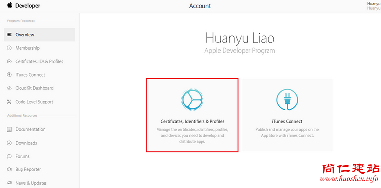 进入苹果开发者中心,点击下图所示位置进入证书、标识符和配置文件管理页面。