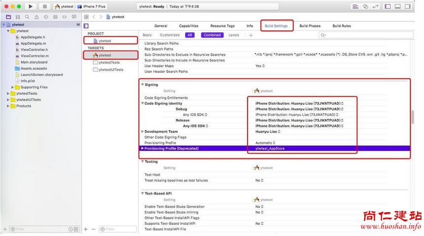在 Xcode 中,点击左侧目录中的项目名称,选择 TARGETS -> Build Settings -> Signing ,将下图所示的文件切换成对应的发布证书和 Distribution provisioning profile ,同理将 PROJECT -> Build Settings -> Signing 中的对应证书和 provisioning profile 也进行切换。