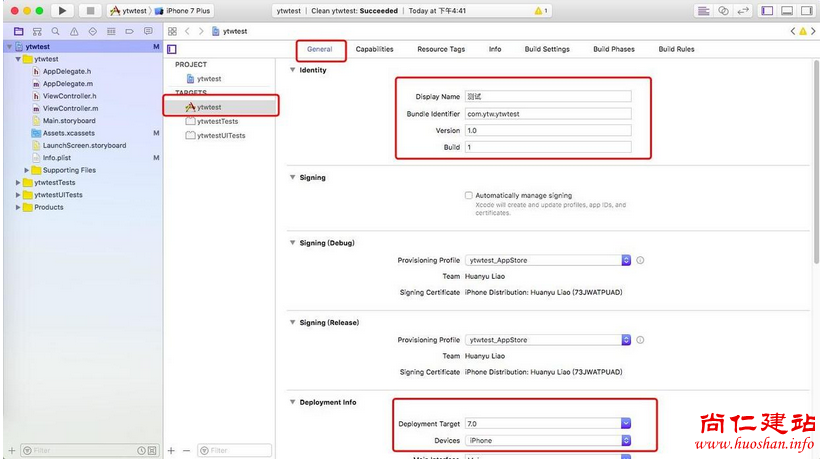 在 TARGETS -> General 中可以编辑 App 的基本信息,包括 App 名称、Bundle ID 、版本号 、适配系统的最低版本号以及设备类型等等。