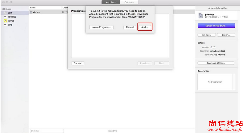 此时会提示选择开发者账号,如之前没有登录,则点击 “Add” 按钮添加账号,若已登录则直接选择相应账号。