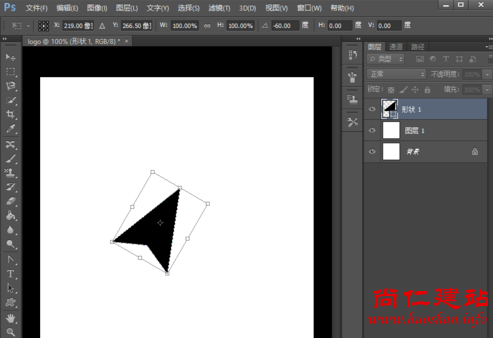 四、选定好形状后,把鼠标放在画布里进行拖动就可以看到形状,当角度、大小等不符合要求时,可以按组合键Ctrl+t来进行更改;