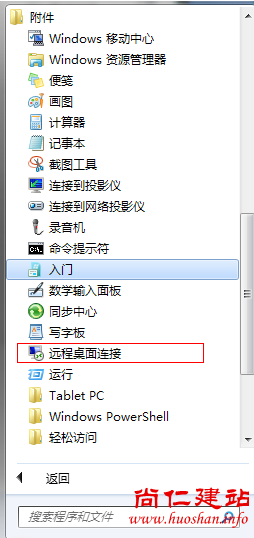 1、选择“开始菜单”-“所有程序”-“附件”->“远程桌面连接”