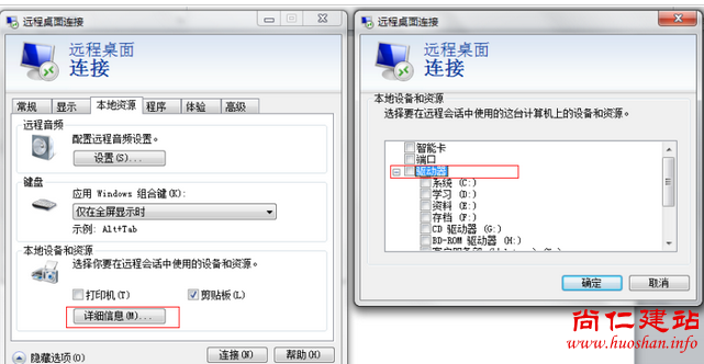 在“本地资源”选项卡中进行设置,一般是会勾选:1)剪贴板(从本地直接复制文字信息时用到,但不能复制文件);2)需要复制文件,需要点击“详细信息”,选择“驱动器”,勾选文件存放的盘符信息,这样就可以了。