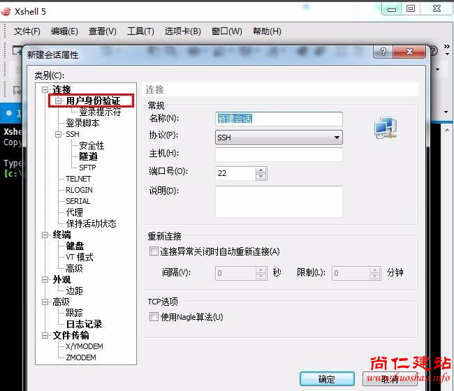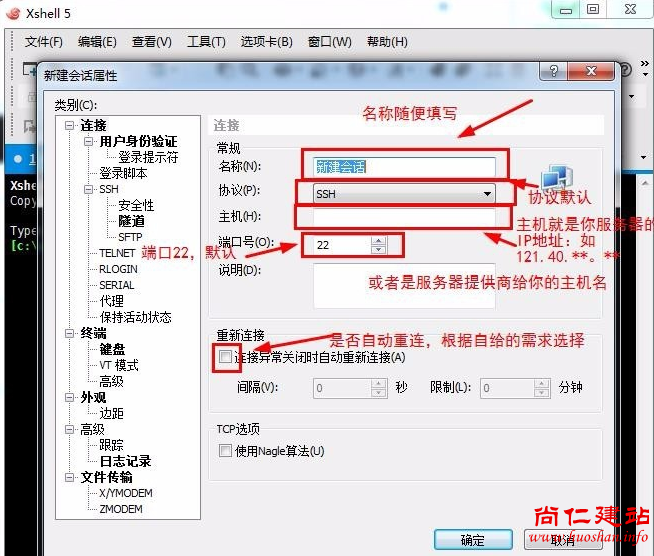 3.点击“新建”之后就会出现下面这样一个界面,“名称”根据自己的需求填写,“协议”就是默认的SSH,“主机”是这一步最关键的,一定要填写正确,否则无法登录,端口也是默认的22,其他不用填,填写完成之后先不要点确定,看下一步。