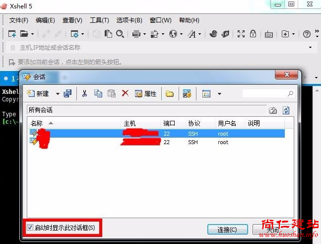 5.那这一步我们来登录我们刚才保存的账号,依次找到左上角“文件”-->“打开”,弹出如下界面,左下角有一个选项“启动时显示此对话框”,这个选项的意思是:每次打开xshell都直接跳出这个对话框,根据需求勾选,然后找到你想登录的服务器,点击“连接”即可。