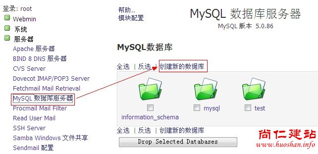 a、点击左侧的“服务器”—“mysql数据库服务器”,然后点击右侧的“创建新的数据库”如图:
