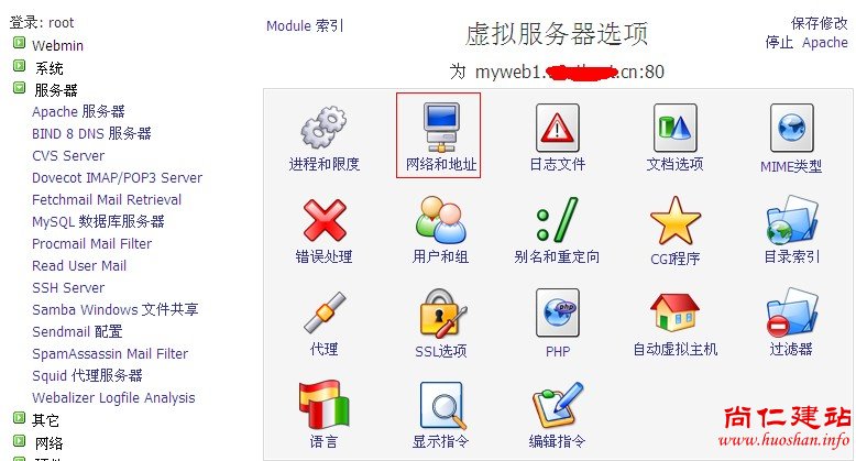 d、如果有多个域名需要绑定,请点击“虚报主机列表”选择您的虚拟主机,进入虚拟主机服务器选项,点击“网络和地址”如图: