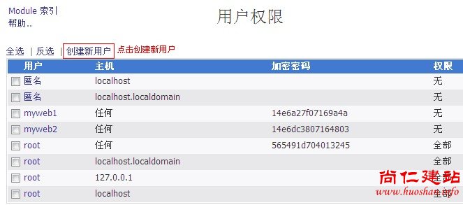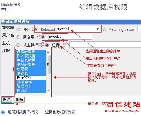 h、选择您的数据库、填写刚才建立好的用户名,主机选择“任何”,最后按住Ctrl键,鼠标选中除了“授予特权”以外的所有权限,最后点保存。如图: