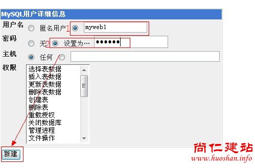 e、输入用户名、密码,主机选择“任何”,点击新建。如图: